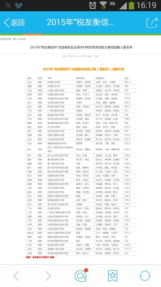 11月19日, 中国高等教育学会高等财经教育分会主办,税友集团浙江衡信教育科技有限公司协办的2015年“税友衡信杯”全国高职及应用本科院校税务技能大赛预选赛在重庆城市管理职业学院赛落下帷幕。我院学子以预选赛重庆赛区第一名,全国第29名的好成绩顺利进入总决赛。